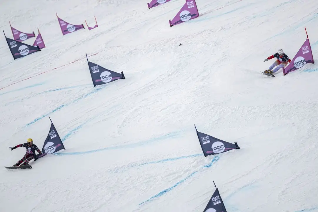 St. Moritz. Dario Caviezel, de Suiza, a la derecha, y Andreas Prommegger, de Austria, en acción durante la final de snowboard al pino de slalon paralelo del Campeonato Mundial de Snowboard, Freestyle y Freeski de la FIS en esta región suiza. Gian Ehrenzeller/Keystone vía Ap