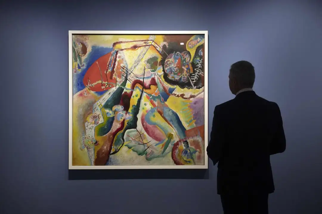 Málaga. Un hombre observa la pintura 'Bild mit rotem Fleck', del artista ruso Vassily Kandinsk, durante la inauguración de la exposición "Vassily Kandinsky, pionero del arte abstracto" en el Centro Pompidou de esta ciudad española. La exposición estará abierta del 28 de marzo al 9 de septiembre de 2025. Foto Afp / Jorge Guerrero