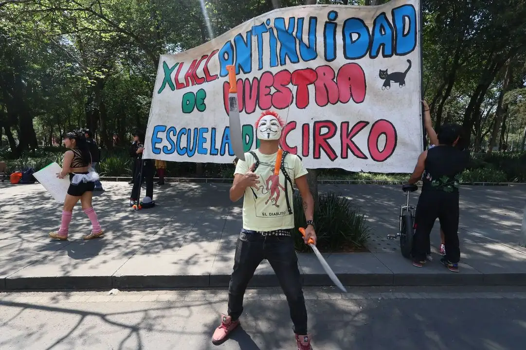 Ciudad de México. Estudiantes y profesores de la escuela Circo De Mente protestan sobre la avenida De la paz ante el cierre de las licenciaturas en Artes Circenses, en la alcaldía Álvaro Obregón.