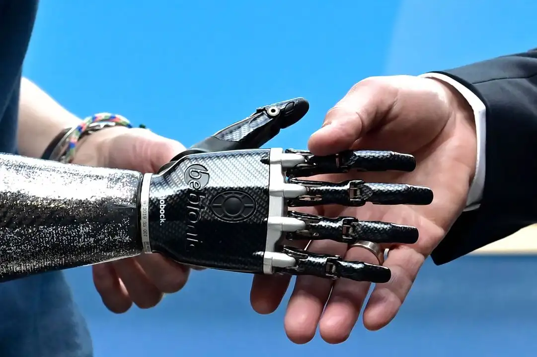 Berlín. El canciller alemán Olaf Scholz (der.) estrecha la mano protésica de un trabajador de la empresa alemana de tecnología médica Ottobock durante la inauguración de la Cumbre Mundial sobre Discapacidad en la capital alemana, organizada por la Alianza Internacional de Discapacidad, el Gobierno de Alemania y el Gobierno de Jordania. Foto Afp / John Macdougall