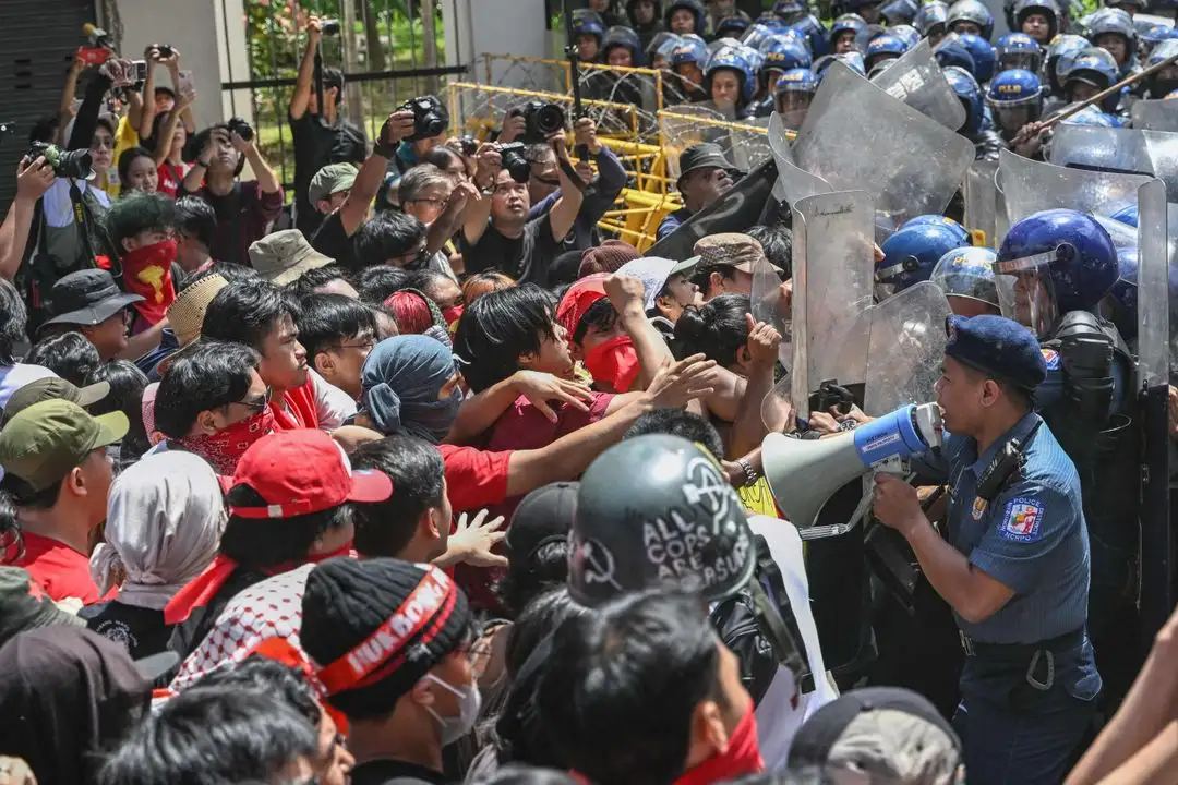 Las imágenes de represión, como cargas policiales o el uso de paraguas como escudos, contrastan con las pancartas con consignas que reivindican la lucha obrera.