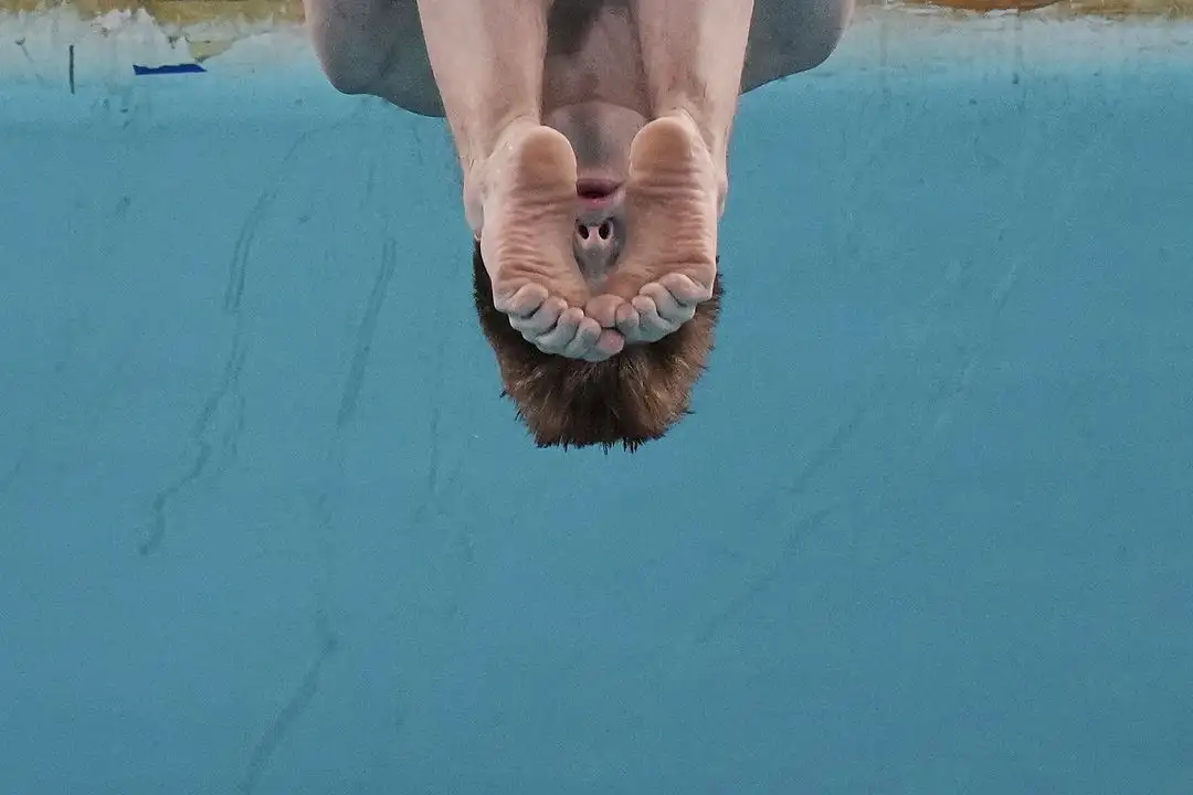Pekin. Oleksii Sereda, de Ucrania, compite en la prueba de plataforma de 10 m masculina de la Superfinal de la Copa Mundial de Clavados, celebrada en el Cubo de Agua de la capital china. Foto Ap / Andy Wong