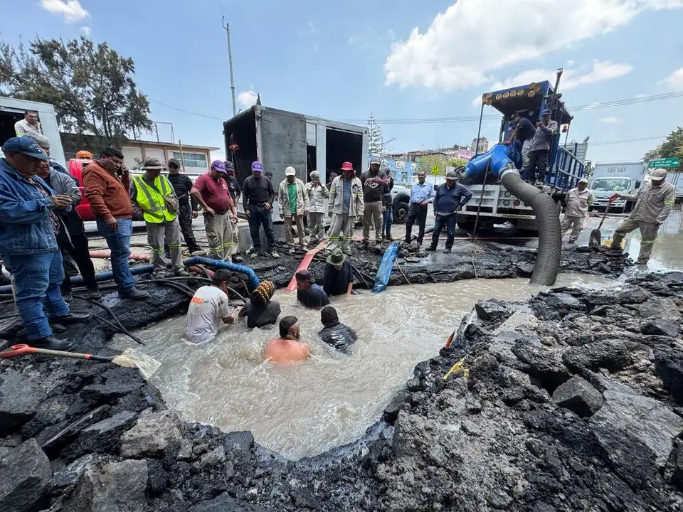 Ciudad de México. Una fuga de agua potable se registra desde ayer en colonias de la alcaldía Venustiano Carranza. Trabajadores se encuentran en la zona para detener la filtración. Foto Alfredo Domínguez