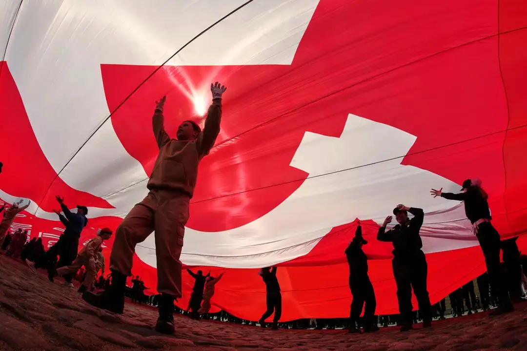 San Petersburgo. Cadetes y jóvenes voluntarios despliegan una réplica gigante de la Bandera Soviética de la Victoria durante la celebración del Día de la Victoria, que conmemora los 80 años de la victoria en la Segunda Guerra Mundial, en esta ciudad rusa. Foto Ap / Dmitri Lovetsky