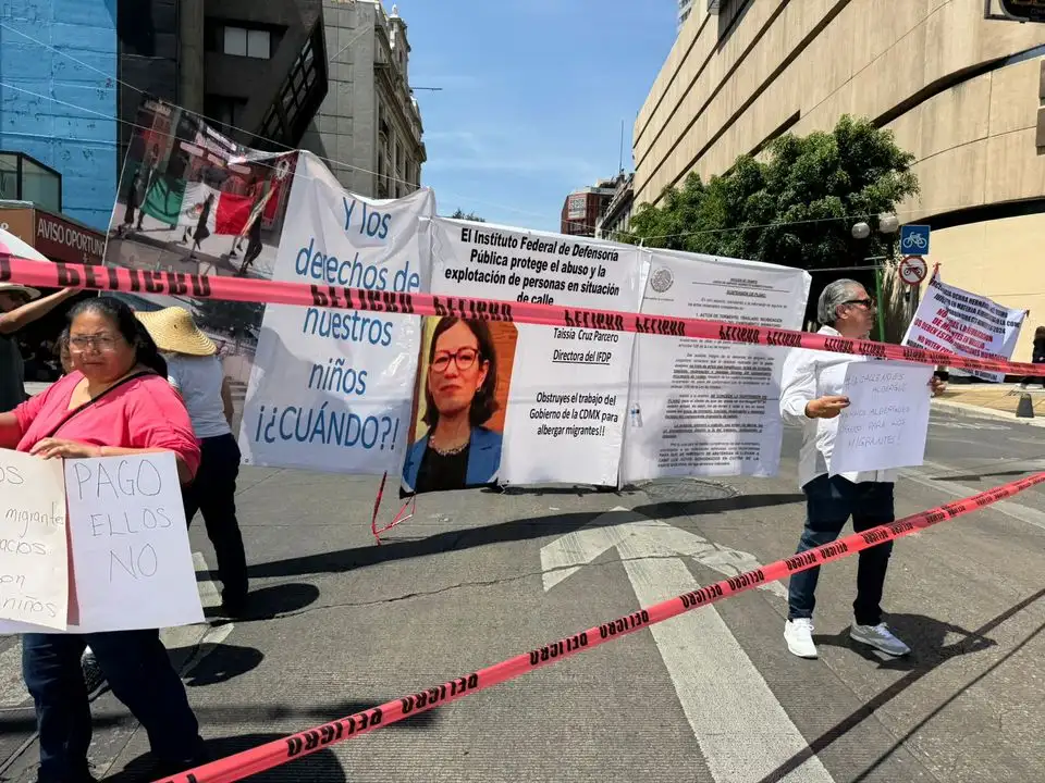 Ciudad de México. Vecinos de Vallejo bloquean la avenida Bucareli al cruce con Paseo de la Reforma para exigir al Instituto Federal de Defensoría Pública que retire el amparo interpuesto por migrantes para evitar ser desalojados de las vías del tren. Asimismo, piden seguridad en la zona. Foto Alfredo Domínguez