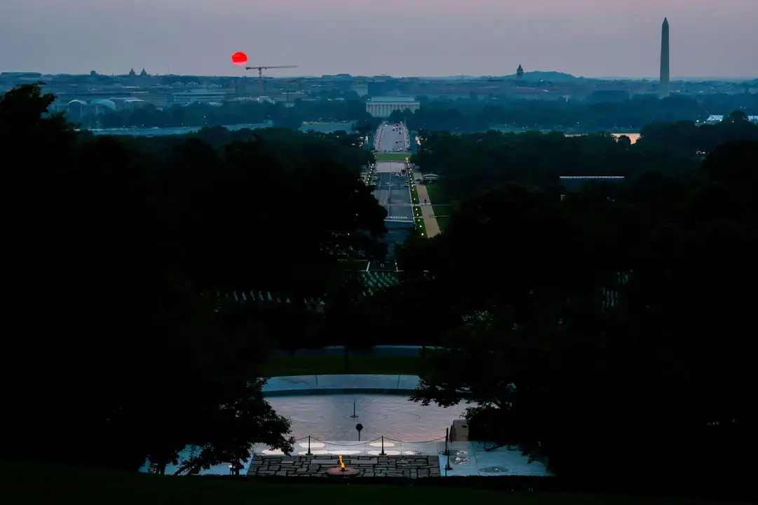 Arlington. El Monumento a Lincoln y el Monumento a Washington se ven al amanecer desde el Cementerio Nacional de Arlington, en este condado de Virginia. Foto Ap / Julia Demaree Nikhinson
