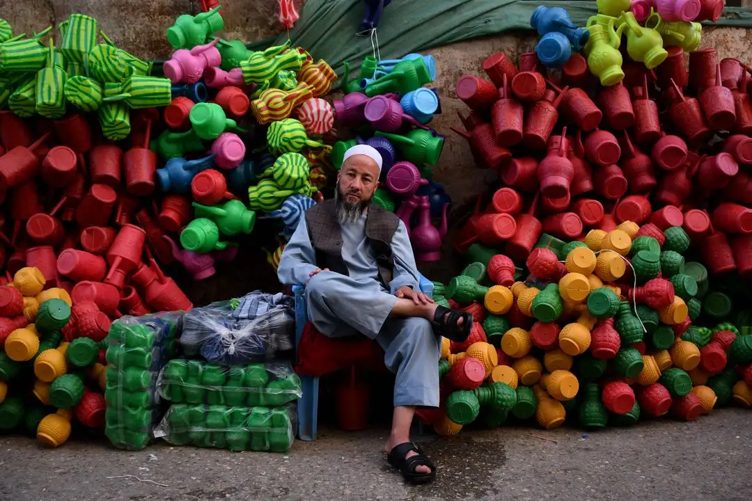 Mazar-i-Sharif. Un vendedor afgano espera a los clientes en su puesto de recipientes de plástico en un mercado de esta región afgana. Foto Afp / Atif Aryan
