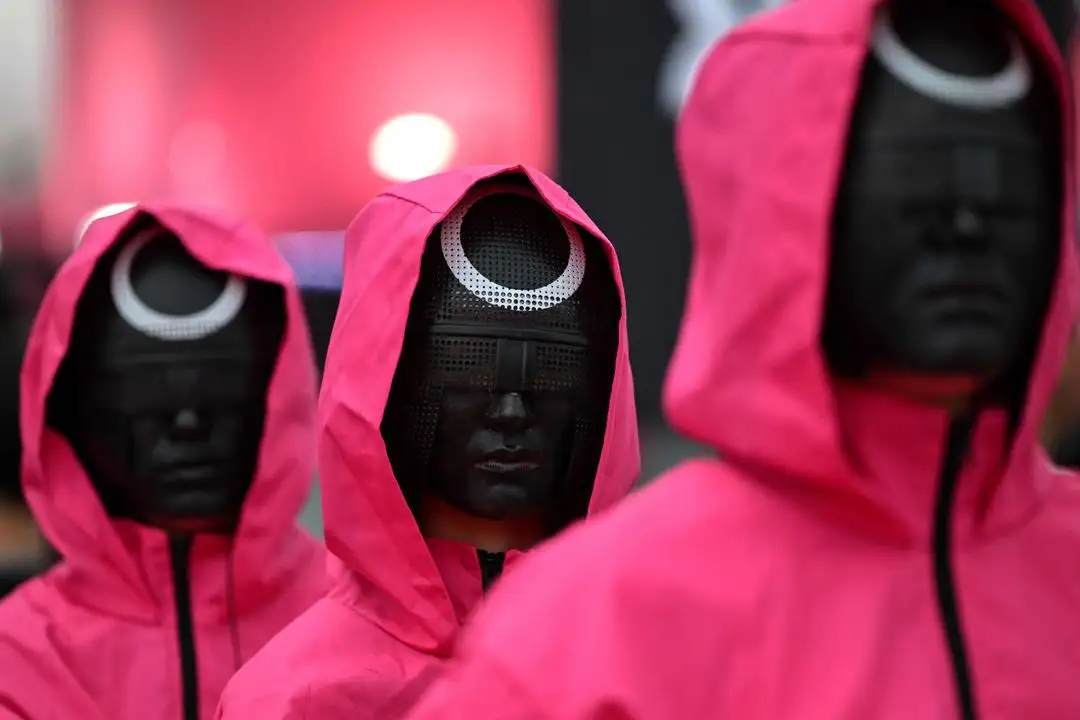 Seúl. Los guardias de rosa de ‘El Juego del Calamar’ se presentan durante un desfile por el estreno de la tercera temporada de la serie surcoreana ‘El Juego del Calamar’. Foto Afp / Jung Yeon-je