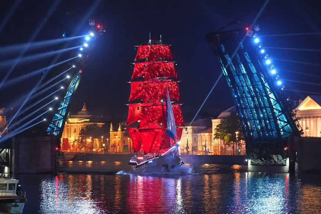 San Petersburgo. Un bergantín con velas escarlatas navega por el puente levadizo Dvortsovy (Palacio) sobre el río Nevá durante un ensayo para las festividades de las Velas Escarlatas que conmemoran la graduación escolar en esta ciudad rusa. Foto