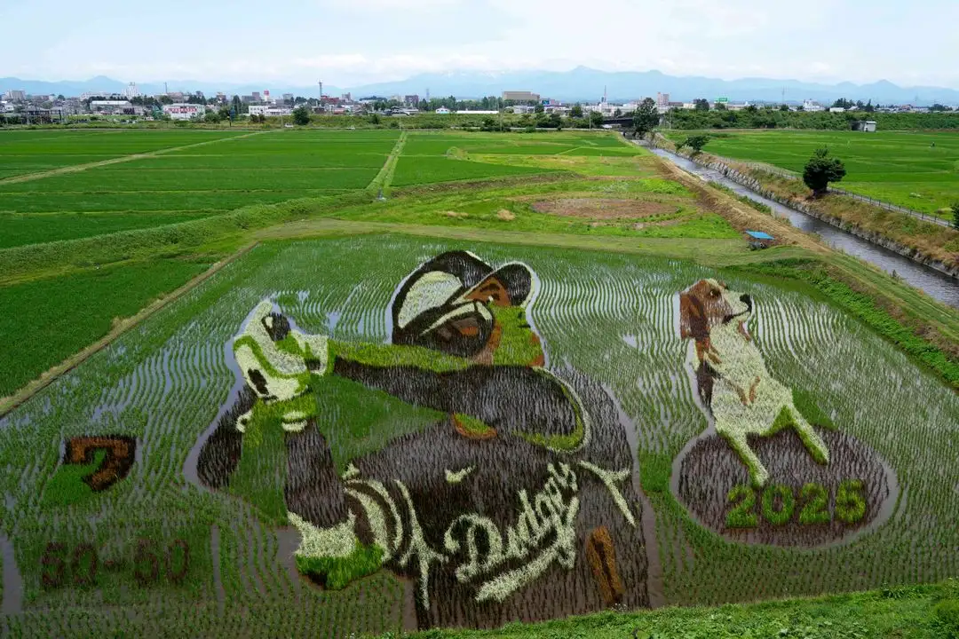Oshu. Arte de arrozal que muestra a la estrella del béisbol Shohei Ohtani, de los Dodgers de Los Ángeles, y a su perro Decoy, en su ciudad natal de Oshu, prefectura de Iwate, Japón. Foto Ap / Gregorio Borgia