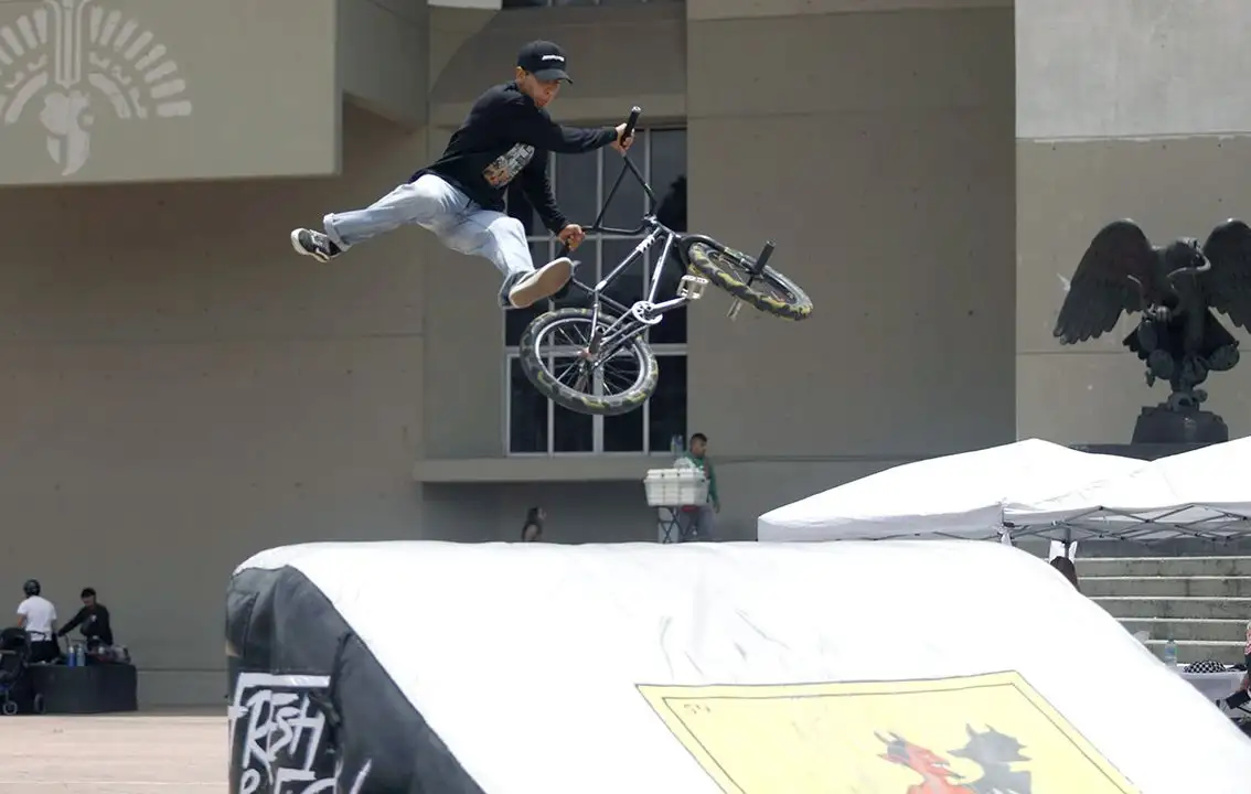 En la explanada de la alcaldía Cuauhtémoc se realizó una demostración de BMX, deporte extremo que consiste en ejecutar acrobacias con bicicleta.