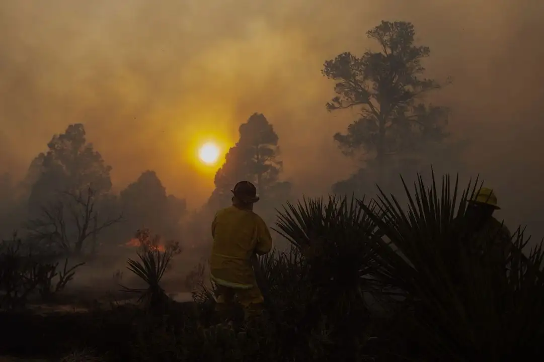 La Rumorosa. Bomberos trabajan en un incendio forestal en el ejido Gustavo Aubanel, cerca del pueblo de este pueblo en Baja California. Las autoridades estiman que el incendio ‘Guadalajara 2’ ha consumido más de 12 mil acres de bosque y matorrales desde que inició, hace 12 días. Foto Afp / Guillermo Arias