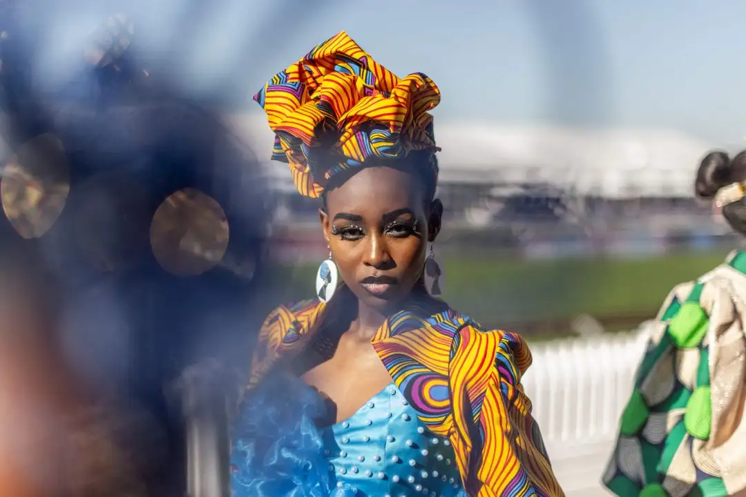 Durban. Una modelo presenta creaciones de diseñadores locales durante un desfile de moda en la edición 2025 de la carrera de caballos de julio de esta ciudad sudafricana, en el hipódromo de Greyville. Foto Afp / Rajesh Jantilal
