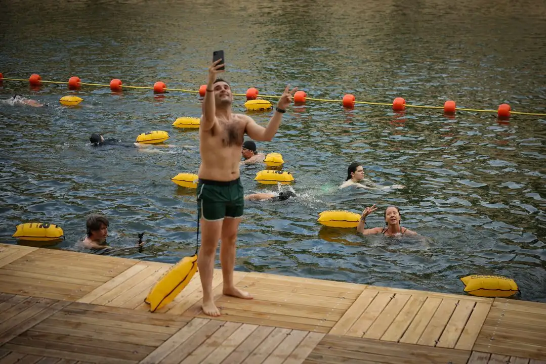 París, Francia. 5 de julio de 2025. Casi un año después de que lo hicieran los atletas olímpicos, los primeros bañistas se sumergieron este sábado en las aguas del Sena en pleno centro de París, que autorizó el baño en el río por primera vez desde 1923. Cerca de la torre Eiffel o frente a la isla de San Luis, cerca de la catedral de Notre-Dame, residentes locales y turistas podrán hacer uso gratuito de estas instalaciones acotadas, que ofrecerán un espacio de ocio.