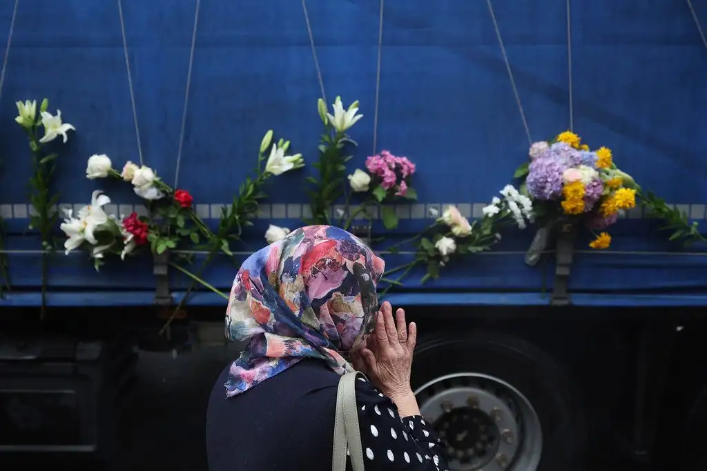 Sarajevo. Una mujer reza junto a un camión que transporta los restos de las víctimas identificadas de la masacre de Srebrenica de 1995 al centro conmemorativo de Potocari, donde serán enterradas el 11 de julio en esta ciudad de Bosnia – Herzegovina. Foto Ap / Armin Durgut