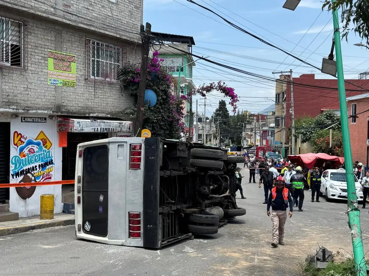 Ciudad de México. Dos personas resultaron lesionadas luego de que un microbús de la ruta 12 volcó en la calle Cerro de la Estrella de la colonia Parajes San Juan, en la alcaldía Iztapalapa. Foto Alfredo Domínguez