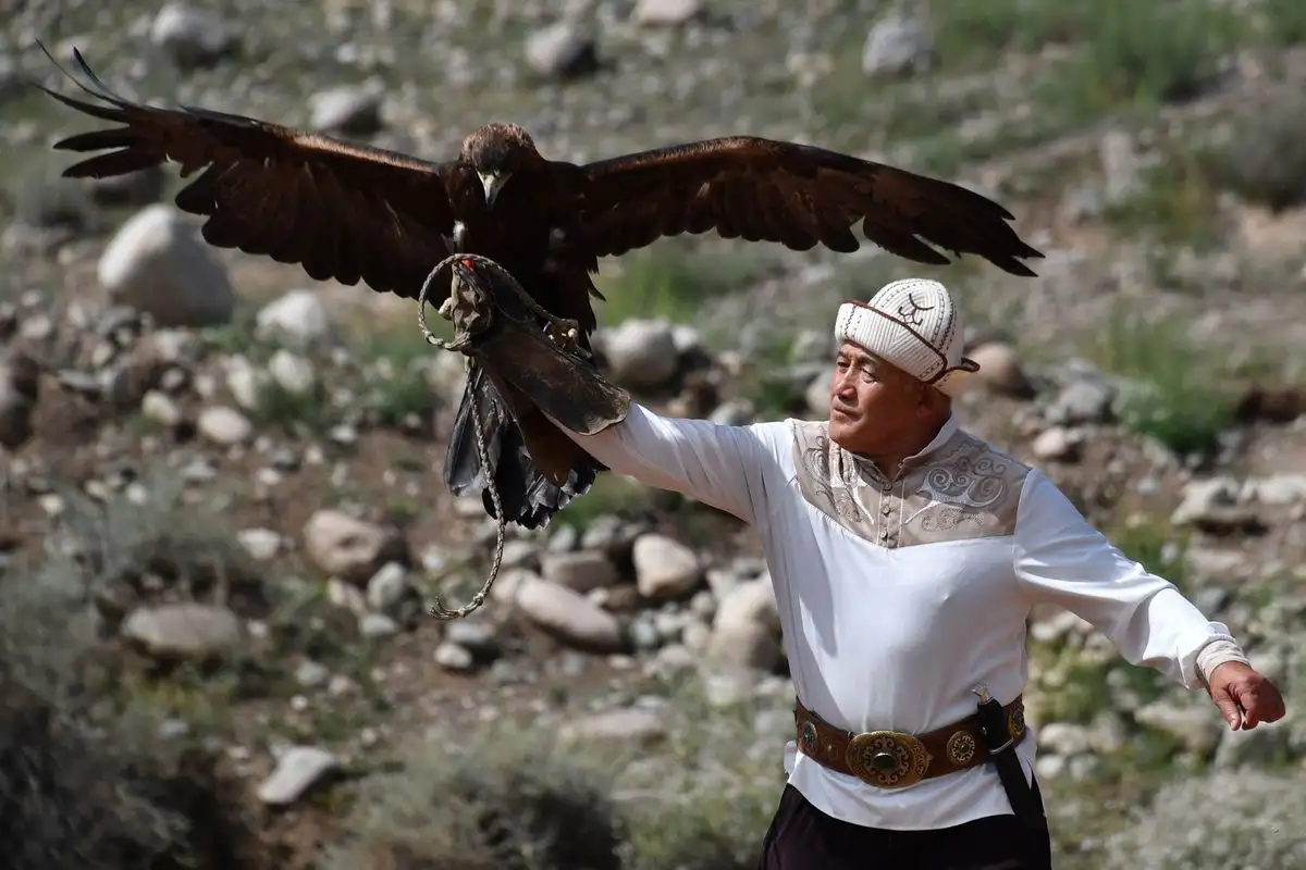 Bokonbayevo. Un cazador de águilas kirguiso, también conocido como berkutchi, se prepara para liberar a este ejemplar durante el festival de caza "Salburun", en esta aldea de Kirguistán. Foto Afp / Vyacheslav Oseledko