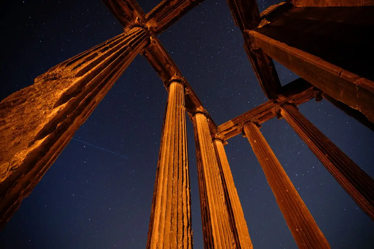 Cavdarhisar. Un meteorito cruza el cielo, visto sobre el Templo de Zeus en la antigua ciudad de Aizanoi, durante la lluvia de meteoros de las Perseidas, cerca de Cavdarhisar, oeste de Turquía. Foto Ap / Emrah Gurel