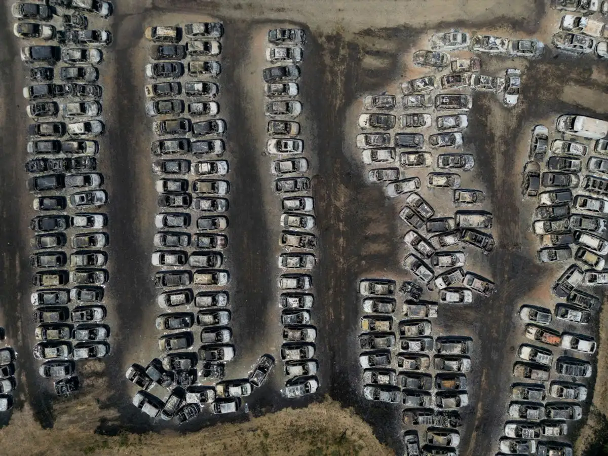 Kato Achaia. Autos quemados en un depósito de esta ciudad, durante un incendio forestal cerca de la metrópoli de Patras, en el oeste de Grecia. Foto Ap / Thanassis Stavrakis