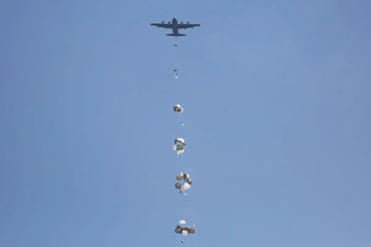 Gaza. Palés de ayuda se lanzan en paracaídas tras ser lanzados desde un avión militar sobre Nuseirat, en el centro de la Franja de Gaza, durante una misión de lanzamiento aéreo sobre el territorio palestino asediado por Israel. El grupo de derechos humanos Amnistía Internacional acusó a Israel de implementar una “política deliberada” de hambruna en Gaza, mientras Naciones Unidas y organizaciones humanitarias advierten sobre la hambruna en el territorio palestino. Israel, si bien restringe severamente la ayuda permitida a la Franja de Gaza, ha rechazado repetidamente las acusaciones de hambruna deliberada en la guerra que dura 22 meses. Foto Afp / Eyad Baba