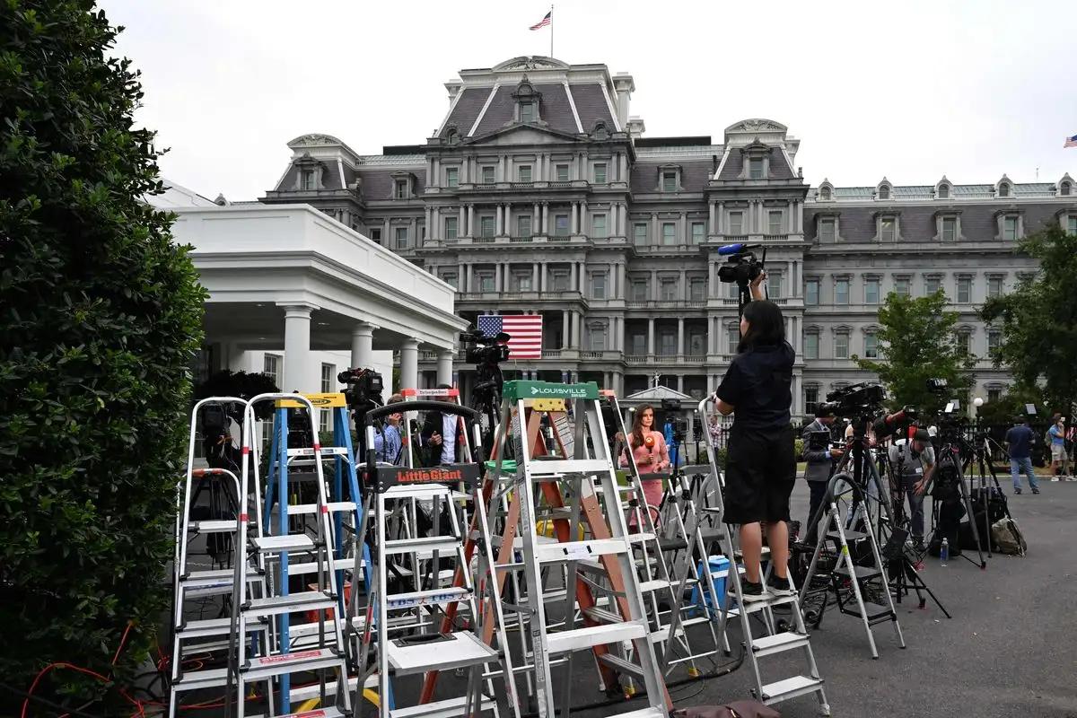 Washington. Trabajadores de los medios de comunicación se encuentran cerca de escaleras instaladas a la espera de la llegada del presidente de Ucrania, Volodymir Zelensky, frente al Ala Oeste de la Casa Blanca en la capital estadunidense. Los líderes europeos se unirán al presidente ucranio en conversaciones con el presidente de EU, Donald Trump, en un intento por encontrar la manera de poner fin a la ofensiva rusa. Los mencionados líderes se autodenominan la “coalición de los dispuestos”. Además de Von der Leyen y Macron, entre ellos se encuentran el primer ministro británico, Keir Starmer, el canciller alemán, Friedrich Merz, y el secretario general de la OTAN, Mark Rutte. También viajaron a Washington la primera ministra italiana, Giorgia Meloni, y el presidente finlandés, Alexander Stubb, quienes mantienen una buena relación con Trump. Foto Afp / Alex Wroblewski