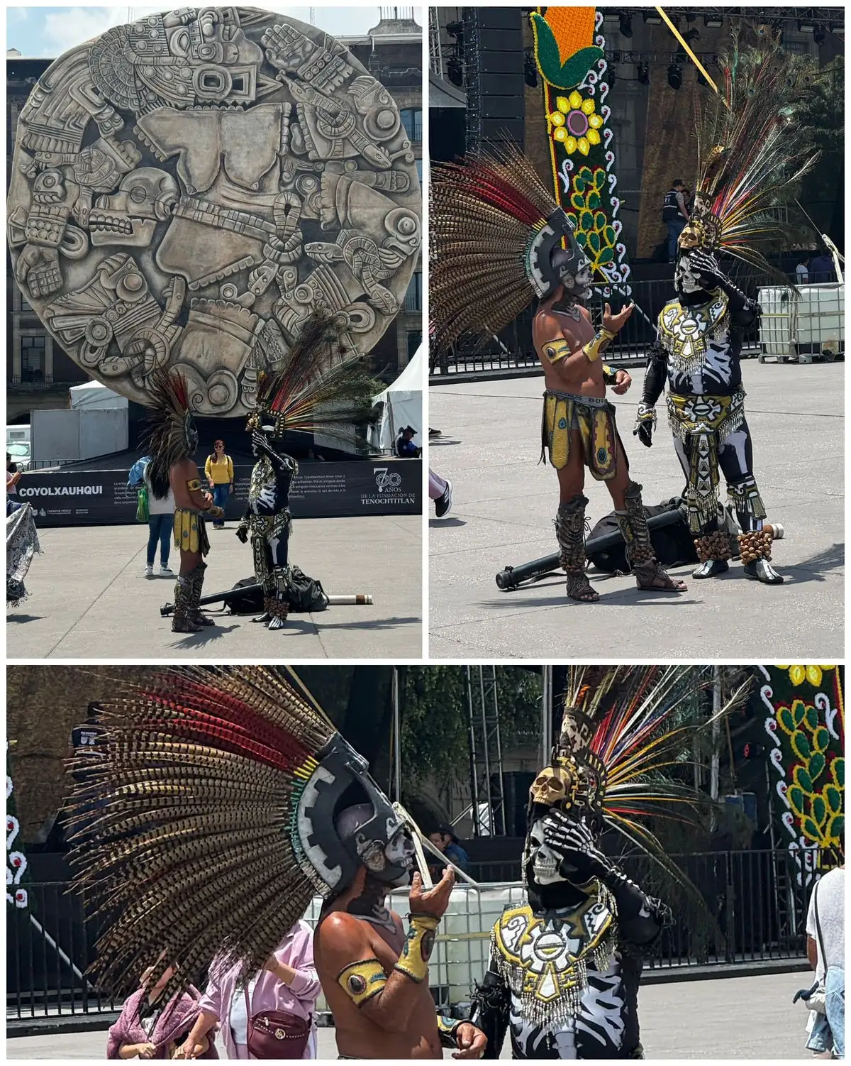 Ciudad de México. Dos personas con atuendos prehispánicos dialogan, mientras se observa de fondo la representación de la deidad mexica Coyolxauhqui, en la explanada del Zócalo, en el Centro Histórico. Foto Luis Castillo