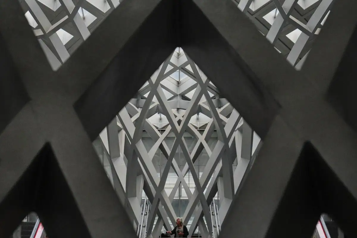 Pekín. Una mujer con su equipaje pasa por una estructura de arte a su llegada a la estación de tren de Chaoyang, en la capital china. Foto Ap / Andy Wong