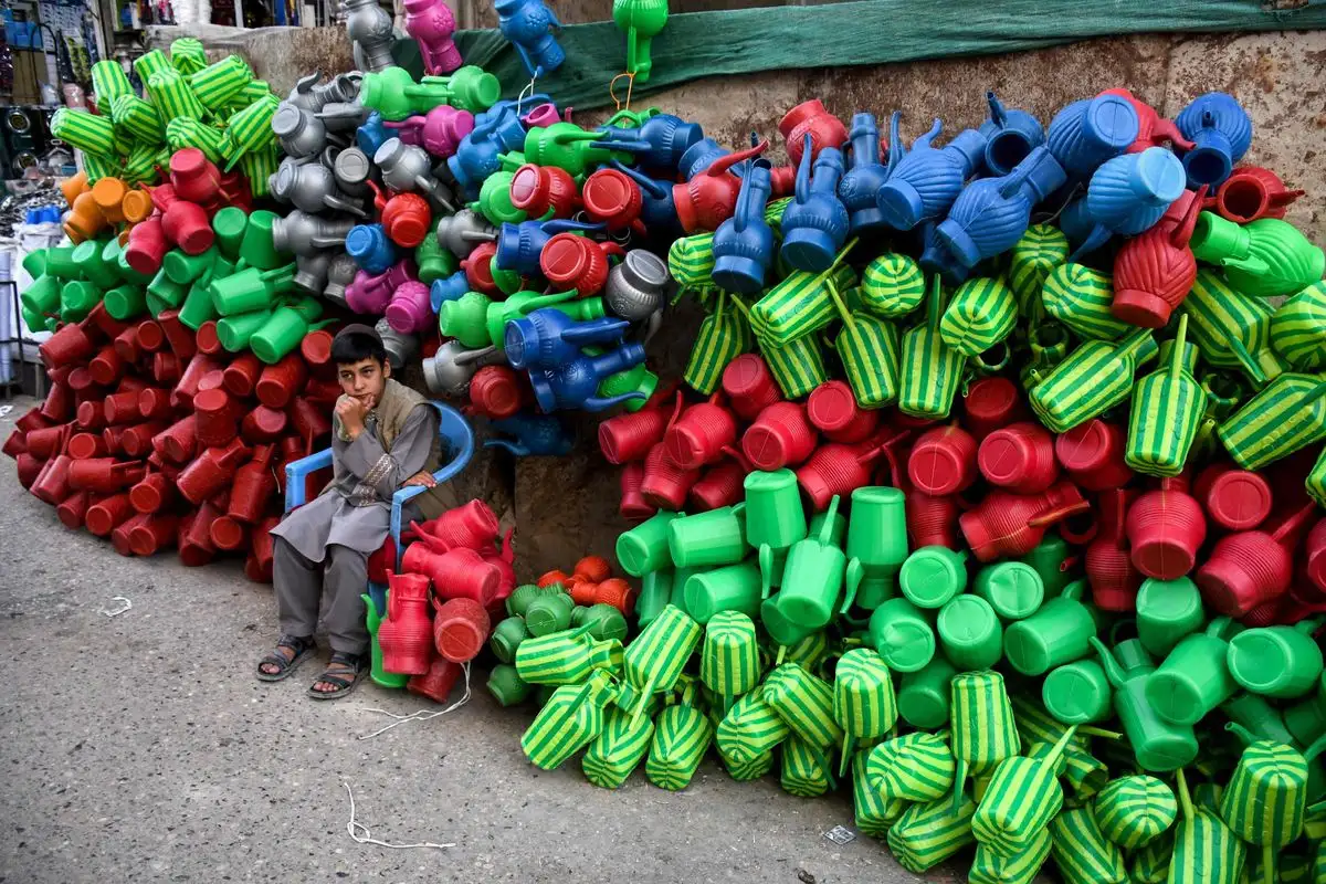 Mazar-i-Sharif. Un niño afgano que vende recipientes de plástico espera a los clientes en un mercado de esta ciudad afgana. Foto Afp / Atif Aryan