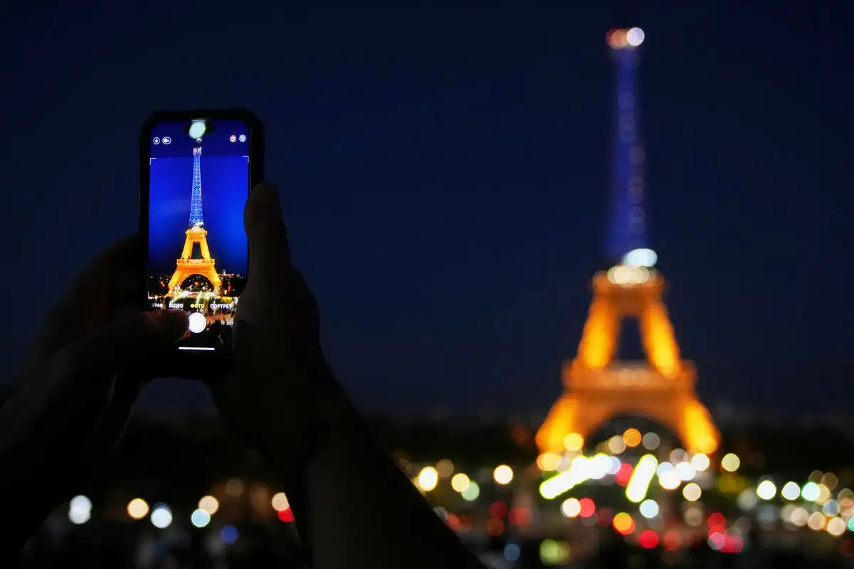 París. Un hombre toma una fotografía de la Torre Eiffel iluminada con los colores de Ucrania en honor a su Día de la Independencia, en la capital francesa. Foto Ap / Christophe Ena