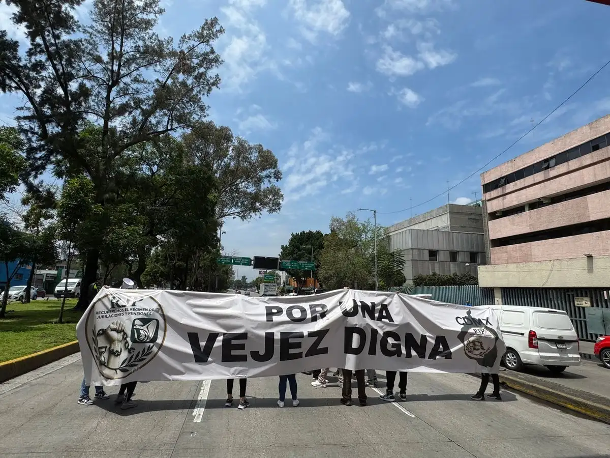 Ciudad de México. Trabajadores del IMSS bloquean Circuito Interior, al exterior del hospital La Raza, para exigir un régimen de jubilación digna para su vejez. Foto Alfredo Domínguez