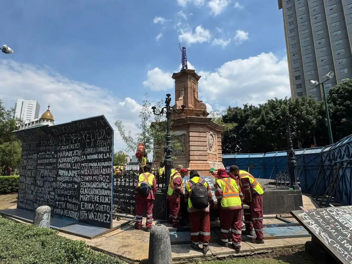 Ciudad de México. Trabajadores el gobierno capitalino retiran las vallas que rodean la Glorieta de las mujeres que luchan, sobre avenida Reforma. Foto Alfredo Domínguez