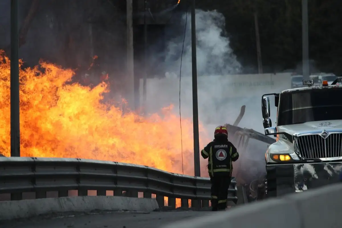 Bomberos y autoridades trabajan para controlar la explosión de una pipa en el Puente de la Concordia, CDMX. Foto: Alfredo Domínguez