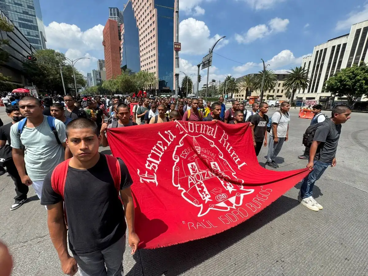 Ciudad de México. Estudiantes y padres de familia de los 43 normalistas de Ayotzinapa se reúnen en Reforma, esquina con Bucareli, para una marcha con dirección a las oficinas de la SRE, a dos días de que se cumplan 11 años de su desaparición. Foto Alfredo Domínguez
