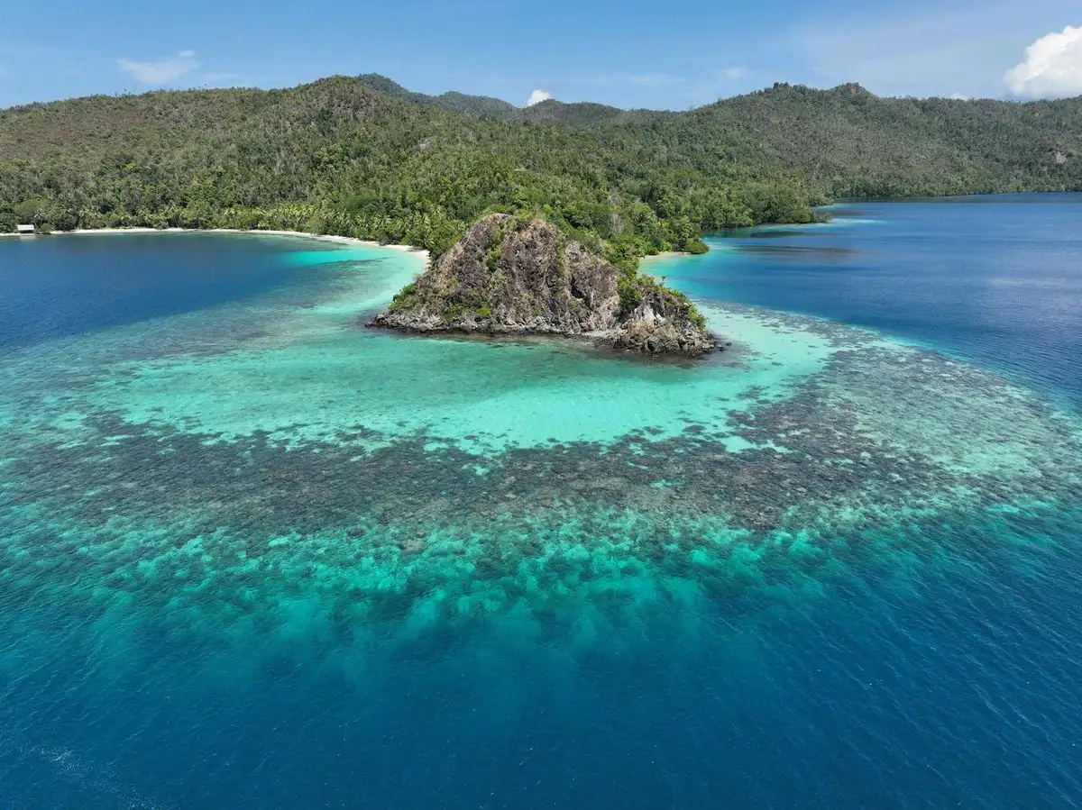 Raja Ampat Islands. Vista aérea los arrecifes de coral que rodean la isla de Batang Pele en Raja Ampat, al suroeste de Papúa. La minería de níquel sigue amenazando una de las zonas de biodiversidad marina y coral más importantes del mundo en Indonesia, a pesar de que el gobierno ha revocado varios permisos, según advirtió un informe del 25 de septiembre de 2025. Foto Afp / Handout Auriga Nusantara