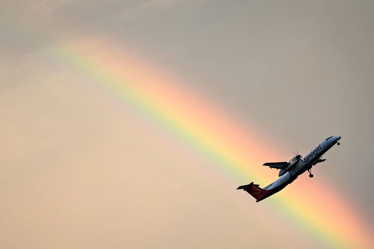 Chennai. Un avión SpiceJet sobrevuela un arcoíris durante el atardecer en esta ciuda india. Foto Afp / R. Satish Babu
