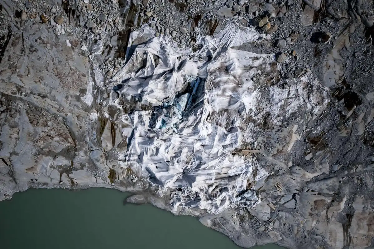 Gletsch. Una tela aislante cubre una pequeña parte del glaciar del Ródano para evitar su derretimiento junto a su lago glaciar. Los glaciares suizos, afectados de forma desproporcionada por el cambio climático, han perdido una cuarta parte de su masa sólo en la última década, según advirtió un estudio ante la preocupación de que el derretimiento se esté acelerando. En 2025, el derretimiento glaciar en Suiza volvió a ser “enorme”, según la red de Monitoreo de Glaciares en Suiza (GLAMOS), añadiendo que se acercaba al récord establecido en 2022. Foto Afp / Fabrice Coffrini