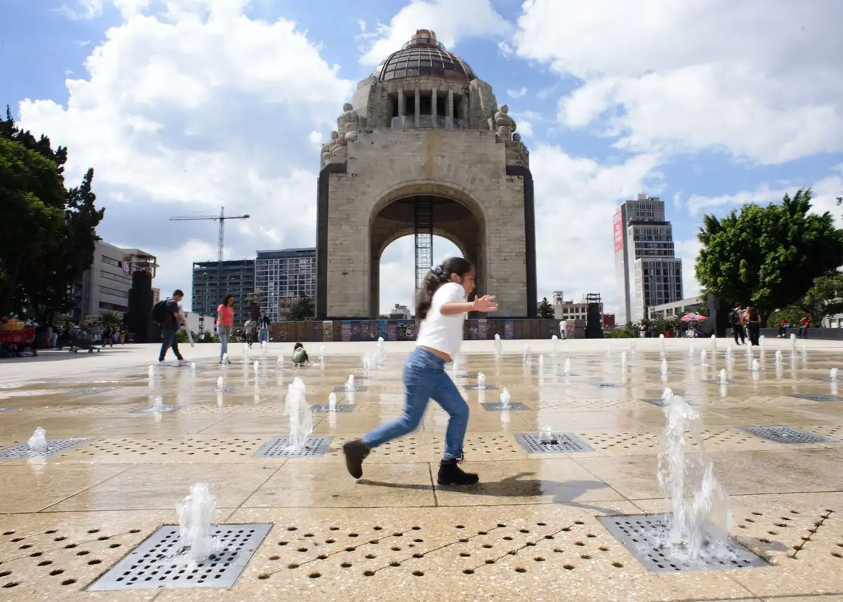 Ciudad de México. Niños aprovechan el día soleado para refrescarse en las fuentes del Monumento a la Revolución. Foto Sergio Hernández Vega