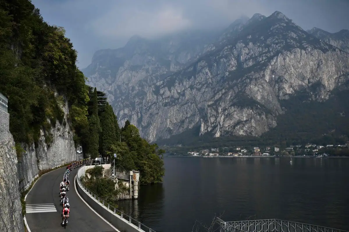 Bellagio. Ciclistas avanzan a lo largo del Lago di Lecco durante la 119ª edición del Giro di Lombardia (Vuelta a Lombardía), una carrera de 238 km entre Como y Bérgamo, en este pueblo italiano.