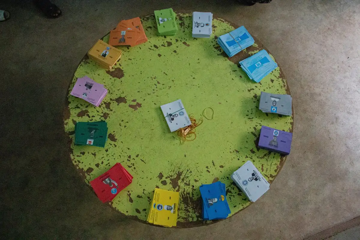 Garoua. Pilas de papeletas electorales con los rostros de los candidatos presidenciales se exhiben sobre una mesa en un colegio electoral antes de que comience la votación en esta comunidad en Camerún. Foto Ap / Welba Yamo Pascal