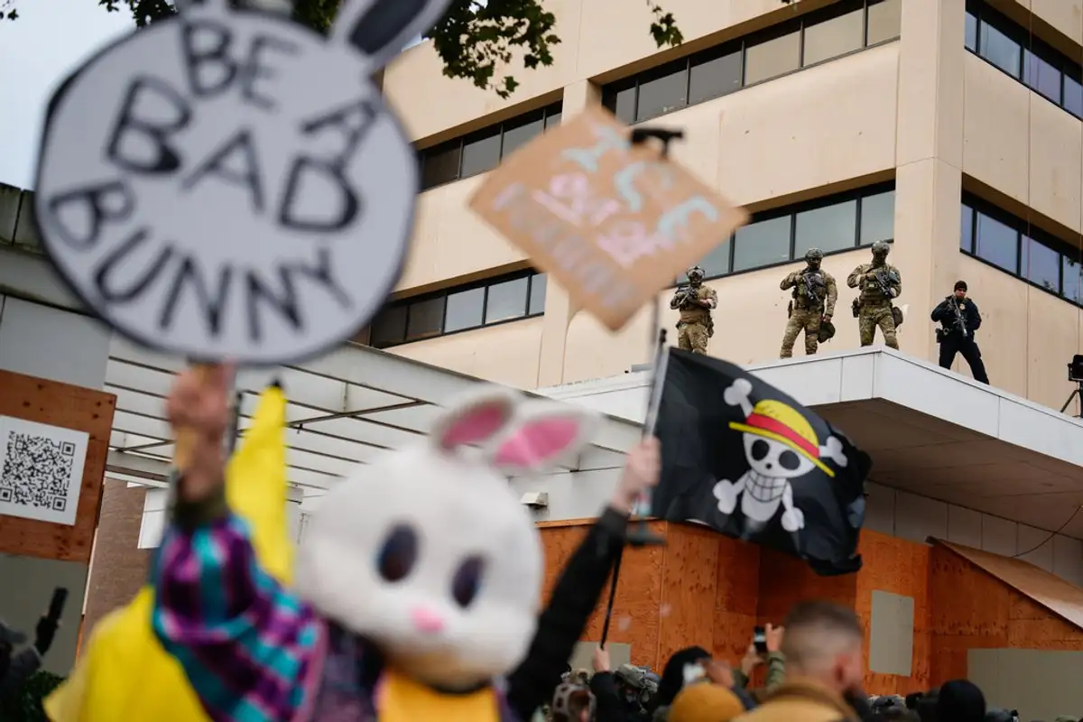 Portland. Agentes del orden observan desde la cornisa de una instalación del Servicio de Inmigración y Control de Aduanas de Estados Unidos (ICE) mientras personas protestan en la vía pública en Portland, Oregón. Foto Ap / Jenny Kane