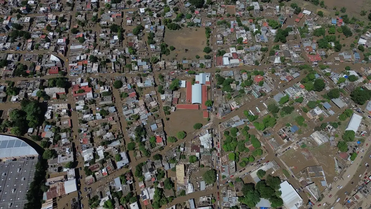 Vista aérea de la unidad habitacional Bugambilias, en Poza Rica, Veracruz, donde calles y viviendas permanecen cubiertas de lodo tras el desbordamiento del río Cazones. Foto: Carlos Nava/ La Jornada