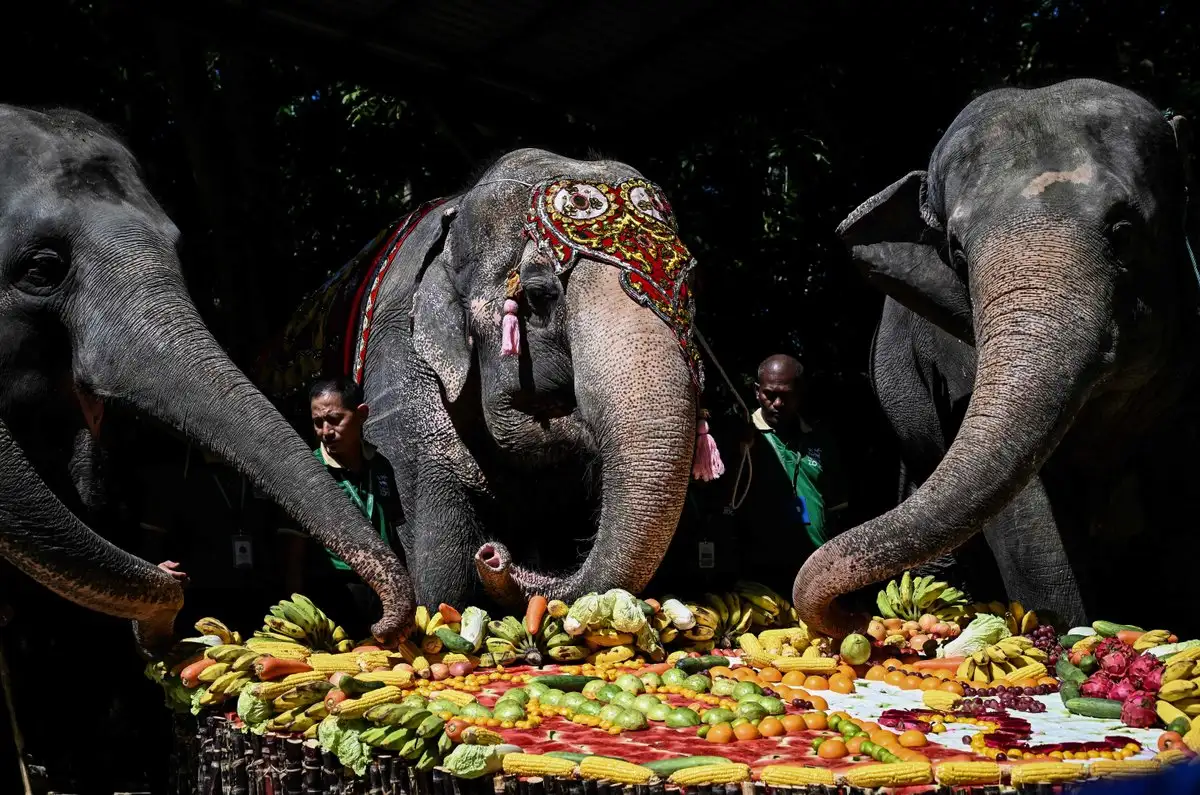 Rangún. La elefanta 'Momo', con adornos bordados dorados, come frutas variadas con otros elefantes durante una celebración por su 72.º cumpleaños en el Jardín Zoológico de esta ciudad en Myanmar, Birmania. 26 de octubre de 2025. Foto Afp / Sai Aung Main