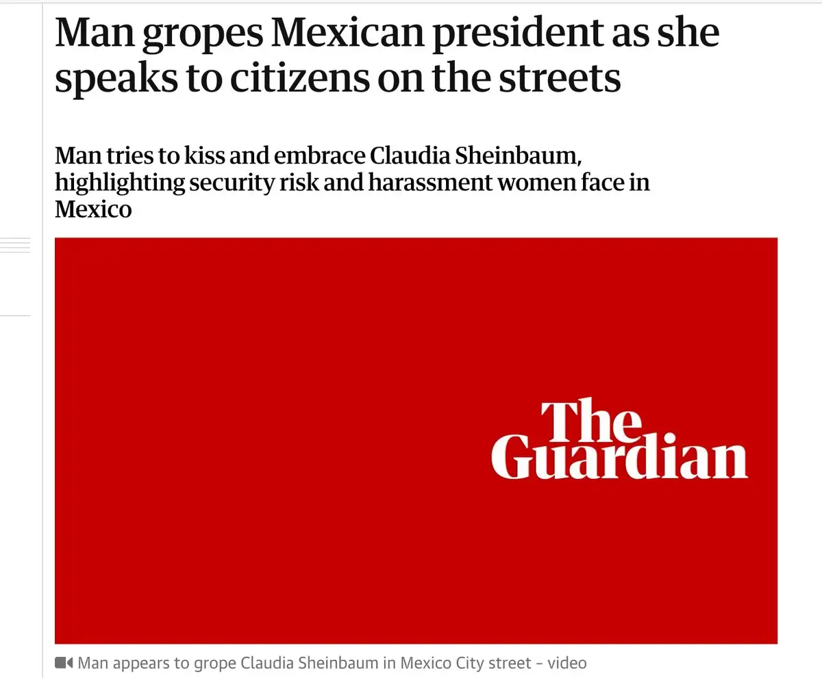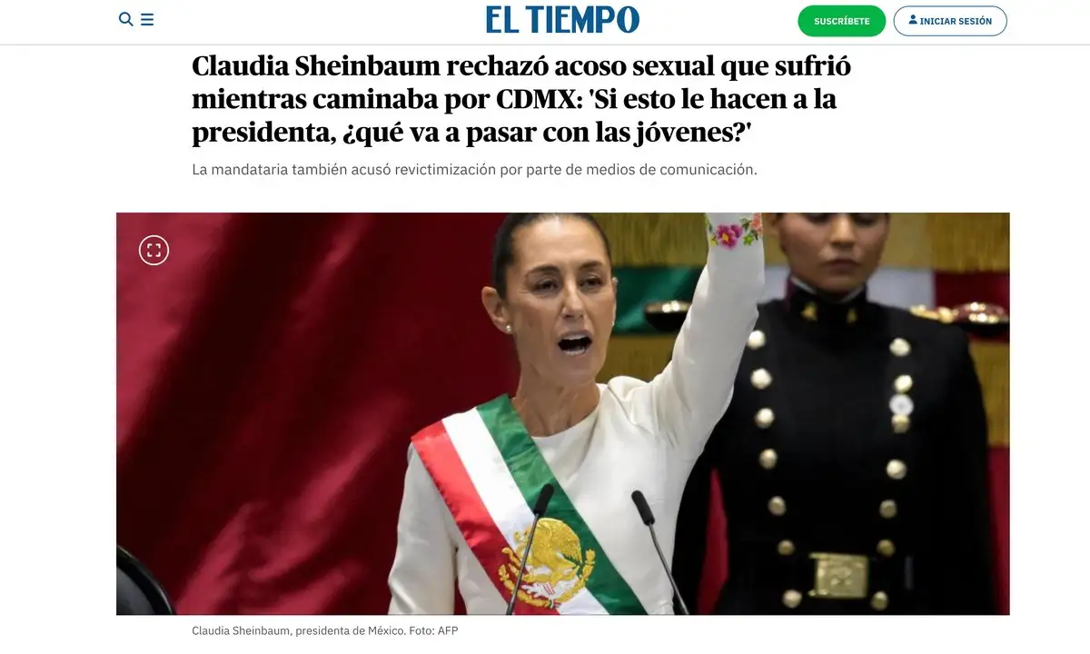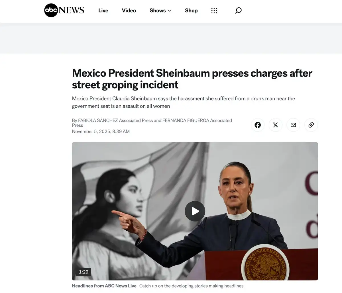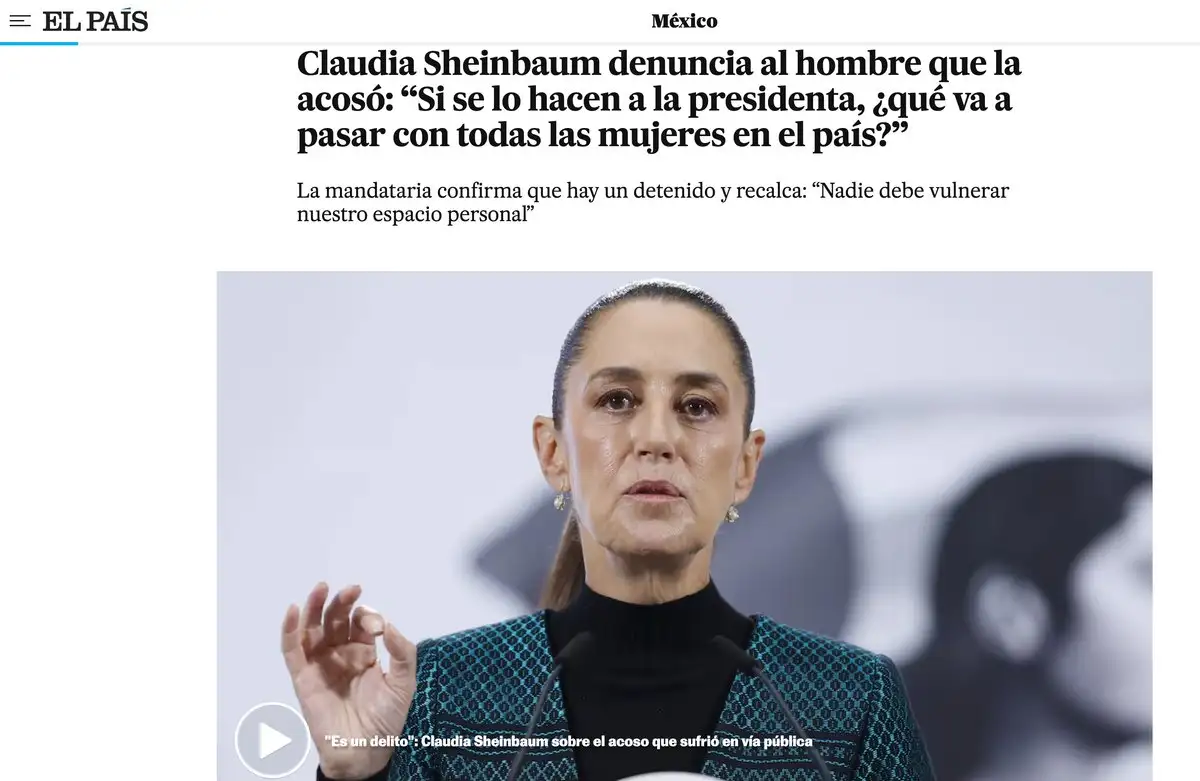 La presidenta Claudia Sheinbaum presentó una denuncia por acoso tras ser acosada por un hombre en calles del Centro Histórico de la Ciudad de México. Medios de todo el mundo retomaron el caso, mientras funcionarias mexicanas y ONU Mujeres condenaron el acto y la difusión de las imágenes como una forma de violencia de género.