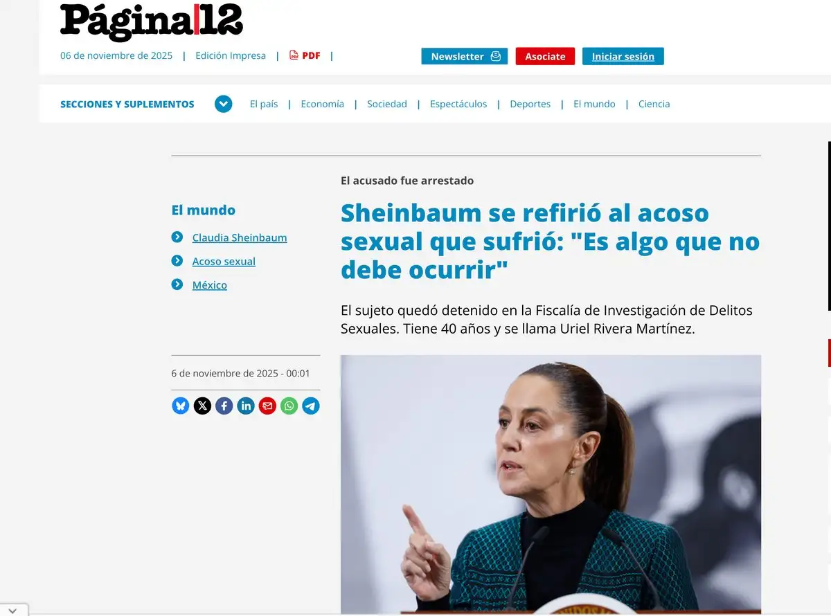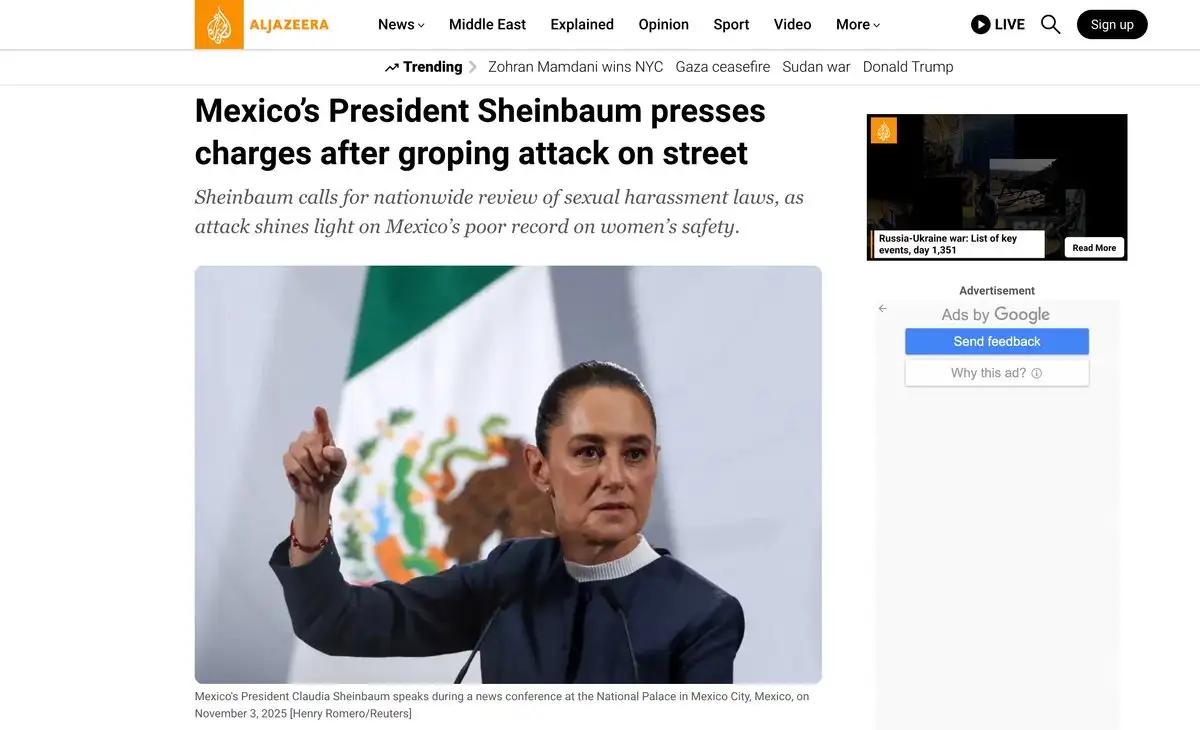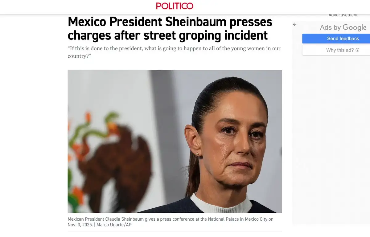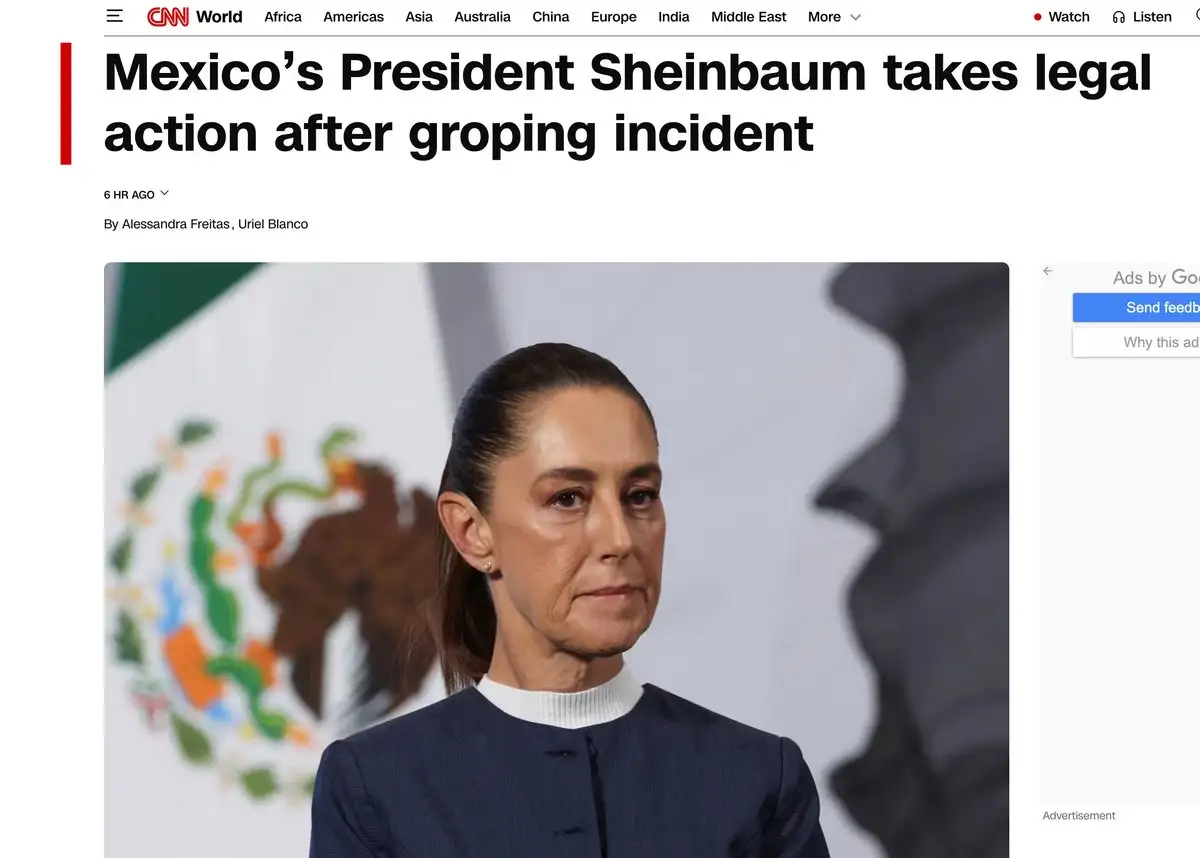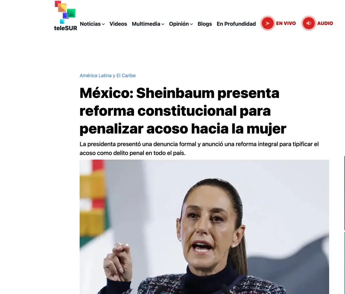 La presidenta Claudia Sheinbaum presentó una denuncia por acoso tras ser acosada por un hombre en calles del Centro Histórico de la Ciudad de México. Medios de todo el mundo retomaron el caso, mientras funcionarias mexicanas y ONU Mujeres condenaron el acto y la difusión de las imágenes como una forma de violencia de género.