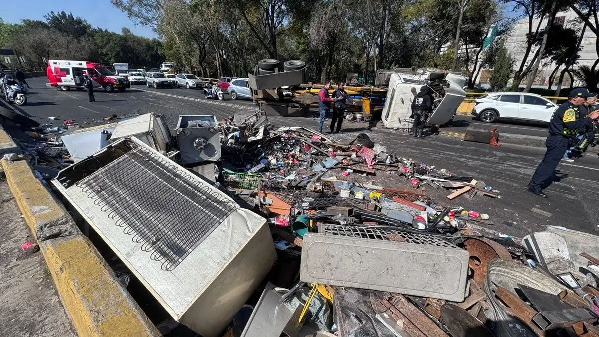 Ciudad de México. Un tráiler que transportaba desechos industriales volcó sobre Circuito Interior, a la altura de la Glorieta de la Raza, con dirección al Aeropuerto Internacional de la Ciudad de México. Bomberos y personal de la SCC-CDMX laboran en el lugar para liberar la vialidad. Foto Alfredo Domínguez