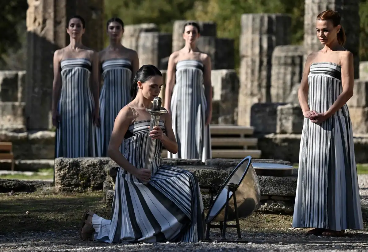 Olimpia. La actriz griega Mary Mina (centro), quien interpreta el papel de la Suma Sacerdotisa, participa en un ensayo del encendido de la llama olímpica para los Juegos Olímpicos de Invierno de Milán-Cortina 2026, en el antiguo Templo de Hera en el sitio arqueológico de Olimpia, al sur de Grecia. Foto Afp / Aris Messinis