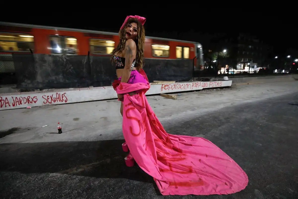 Trabajadoras sexuales trans independientes bloquean la calzada de Tlalpan, a la altura del Metro Chabacano, para exigir la presencia de la jefa de Gobierno, Clara Brugada, y una solución al cierre generado por las obras de la ciclovía. También demandan respeto a su labor. Ciudad de México, 24 de noviembre de 2025. Foto: Cristina Rodríguez / La Jornada.