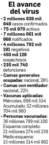 La curva epidémica de Covid-19 en México continúa al alza. Los casos confirmados se incrementaron entre miércoles y jueves en 12 mil 821, con un total de 2 millones 629 mil 648 contagios. Los decesos aumentaron en 233, para un acumulado de 235 mil 740, mientras que personas que se han recuperado alcanzan los 2 millones 68 mil 175.
