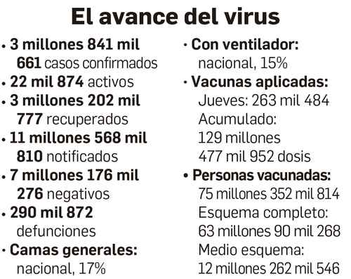 El jueves se aplicaron 263 mil 484 vacunas, con lo que se han administrado 129 millones 477 mil 952 dosis desde diciembre.