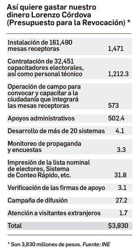 “¿Eres de los contribuyentes que no saben cuáles son los costos reales de una revocación de mandato? ¿O, sabiéndolo, ‘mientes y descalificas vulgar y arteramente’?” El presidente del Instituto Nacional Electoral (INE), Lorenzo Córdova, peleonero y soberbio –lo han hecho soñar los de PRI, PAN y PRD de la Alianza por México que puede ser candidato a la Presidencia–, escribió utilizando esos términos un tuit en que describe las partidas que integran el presupuesto. Pueden verse en el cuadro que aparece en esta página. La mayoría de los mexicanos descalifican que se derroche de esa manera el dinero, por lo tanto, son, según Lorenzo Córdova, merecedores de sus insultos.